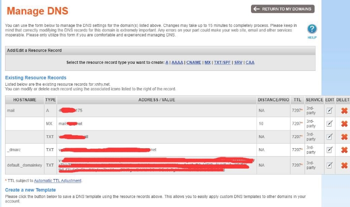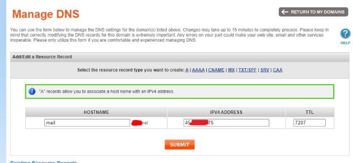 其实就是添加一条A记录,主机记录填mail,记录值填写你的服务器IP即可,我的域名商是Namesilo ,所以这篇文章用Namesilo给你们举例,看下我在Namesilo解析处的设置,可以参考: