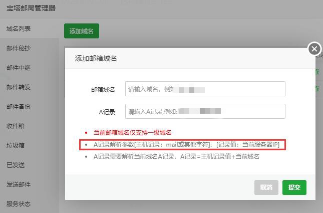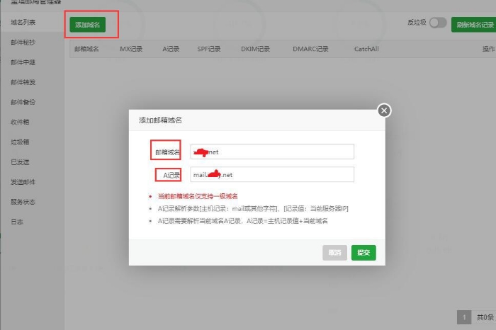 3. 点击左上角添加域名,按照宝塔邮局的指示, 邮箱域名处填写你的一级域名(不带www),A记录处填写 mail.你的域名,如图:
