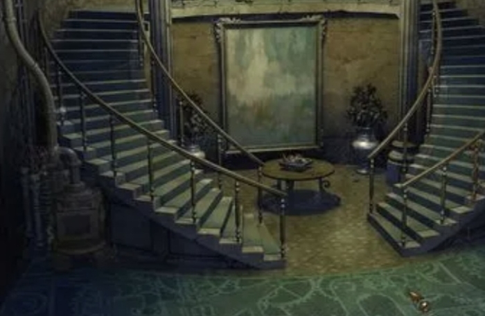 一楼是会客厅,地上铺满了紫黑色的石板,上面刻着奇特的花纹;门对面的墙上有几副巨大的壁画;尽头处摆放着一个木质圆桌和几把紫藤椅,桌上有一个茶壶,旁边摞着若干茶杯;还有一些盆栽散落在房间各处,倒是给这个地方增添了些许生机和自然;两侧是分别向相应方向盘旋的扶梯,共同通往二楼;天花板的中央垂下一盏巨大的吊灯。
