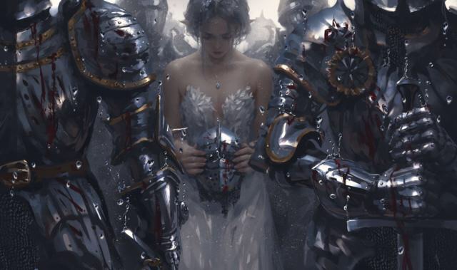 婚礼当天,士兵从城门两侧一直延伸到圣彼得宫门口,士兵们高举俩国旗帜,街道上摆满了鲜花安德鲁骑着一匹白马走在迎亲队伍的最前方不时向边上的民众挥手致意,他一袭白衣,左手边挂着宝剑,右手牵着马绳,向着宫殿前进停在了广场中央。而殿变的放内,身着纯白色婚纱的少女双手紧握,脸上爬满了红色,蓝色的头发垂在身后,她便是公主菲谱莉,而她的守护骑士被她禁止入内,房内仅她一人。门外达芙迪尔一身铁甲,披风将肩膀半遮住,头上带的是印有红十字标志的头盔。布满了剑痕,双手扶着剑站在门口。
