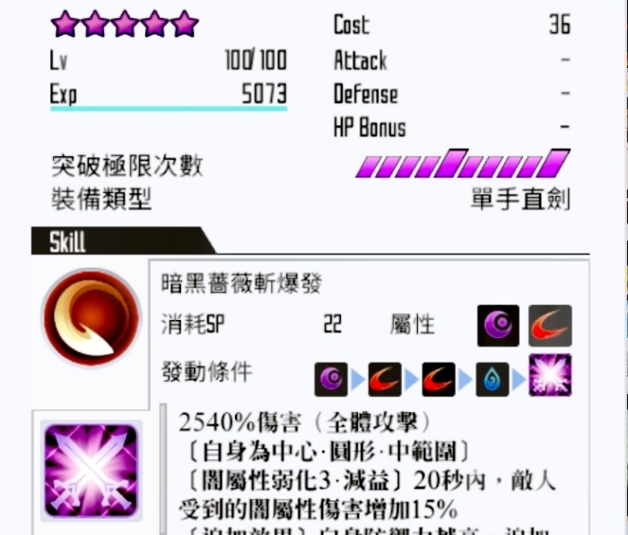 除此之外,ai还有一项特殊的技能"【暗黑蔷薇斩•爆发】,而这个技能的爆发条件是,需要连续使用4个剑技才能激活爆发状态。然后释放出2540%强力攻击,同时具有追加伤害和两秒的无敌状态,20秒内,敌人受到的暗属性伤害增加15%。