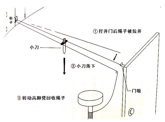 「那么,开门的力度不同,匕首掉落的方向也不同呢,如果侦探没有用适合的力度触动机关,那也能让匕首完美插进被害人体内吗?还有,将匕首放在绳子上,万一在机关触发之前就已经掉落了那怎么办啊?」