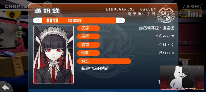 戴上手套之后,雾切响子推开了门,按照走廊上的提示来到了体育馆,有一点她很奇怪,明明应该是在教室醒来才对,可是她却在宿舍醒了过来。