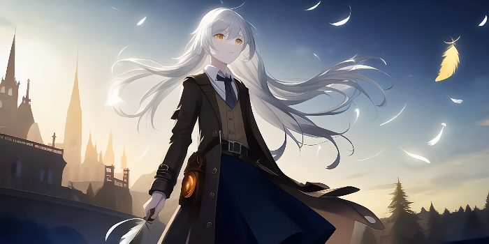 在这古老的建筑群中,一名白发少女站在古堡前。