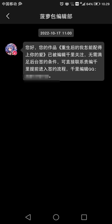 ps:为了表明作者滴良心大大滴有,就给你们看张截图吧!这还是五天之前我收到的内签消息哦,但是毕竟是处女作,所以说我打算一直免费,给大家看好了^ω^