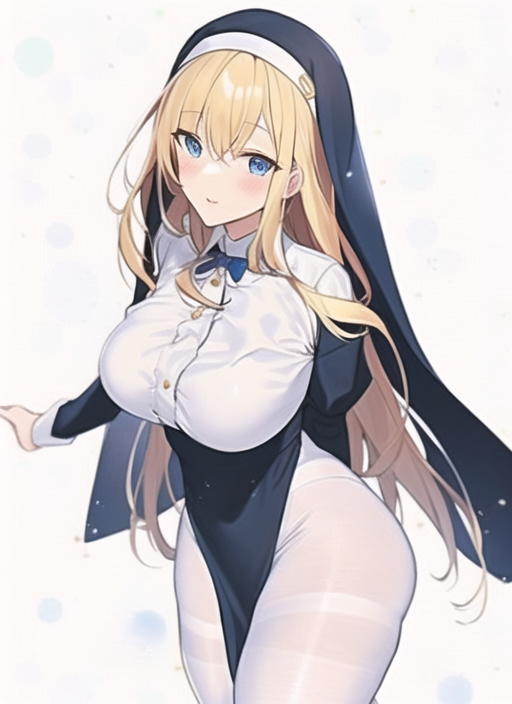 少女穿着象征神圣的修女服,头戴装饰性质的头巾,金发垂至腰间。