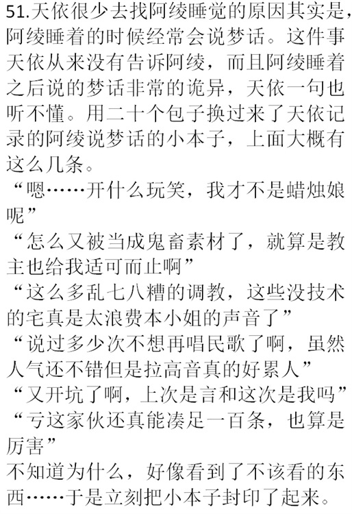 48.星尘事件之后,阿绫脑子里一直存留着那个疑虑,心想自己有没有可能是被人虚构出来的。阿绫有一天在一张纸条上,写下了自己可能存在的原因。可能一,自己是被一个宅男坐在电脑前一边吃炸鸡一边想出来的。可能二,自己是被某个音乐集团的画师给画出来的。可能三,自己是被三次元人的声音录制之后创作出来的。可能四,自己的故事都是某个网站上的up主在音乐里想出来的。可能五,自己的故事是被某个无聊的宅男在贴吧上写出来的。最后阿绫自己都看笑了,心想自己的脑洞真是大过天际,怎么可能会有这种事呢。于是阿绫把那张纸条扔进了火炉里。