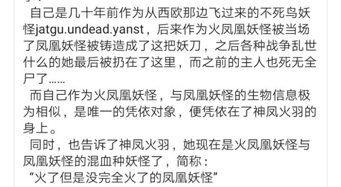自己是几十年前作为从西欧那边飞过来的不死鸟妖怪jatgu.undead.yanst,后来作为火凤凰妖怪被当场了凤凰妖怪被铸造成了这把妖刀,之后各种战争乱世什么的她最后被扔在了这里,而之前的主人也死无全尸了……