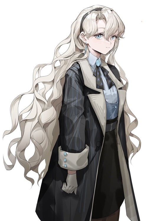 外貌:白金色的打卷长发,披散下来直到腰部,但是每一根发丝都很细,在前额有着非常调皮的分叉和翘曲。如同湖水一样湛蓝的眼睛水波盈盈,很容易看得出来在想什么,在解放蚀刻时会有流动的蓝光亮起。