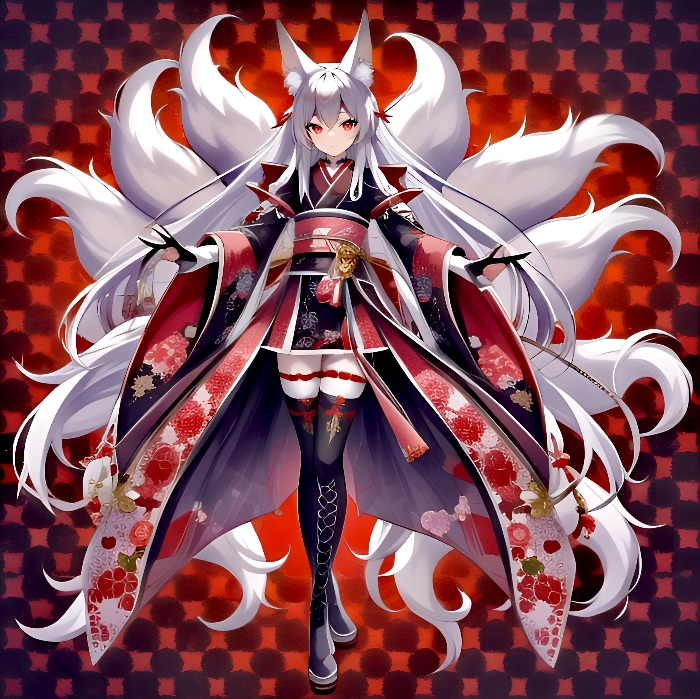 头上的银白色狐耳和身后九条晃动的狐狸尾巴为本人增添了几分可爱。