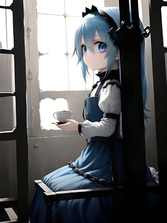 被铁链铐在冰冷的椅子上,眼神中闪烁着迷茫,仔细看眼角还有点血,但手里的红茶又表明她绝不是阶下囚。