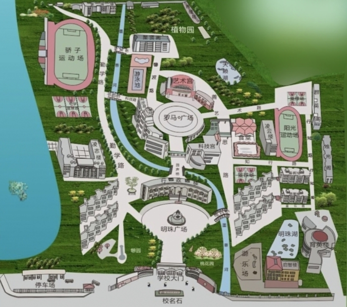 长明学校的布局是和一般学校不一样,行政楼艺术宫之类的建筑都是偏圆形的,立在一个中轴线上。教学楼却是从上往下看是楼梯状的,平行的分布在学校两侧。