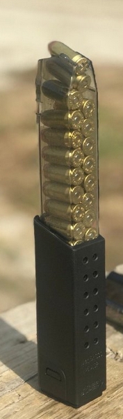 1.首先是.45ACP口径的Vector冲锋枪使用的30发Glock 21手枪弹匣。原本的弹匣可能只有10-13发,但是Kriss公司自己出了弹匣延长套,能让通用的手枪弹匣扩容达到30发。下图为网络找的半透明弹匣改件版,但不知道出处。