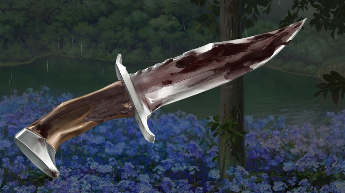 “我.....把雫……?”冰冷的雨水打在我的身上,把我以及我的刀都淋湿了,犹如在隐藏证据一般冲刷而下。终于泪水流了出来,我无能地锤打着池边梧桐的树干。