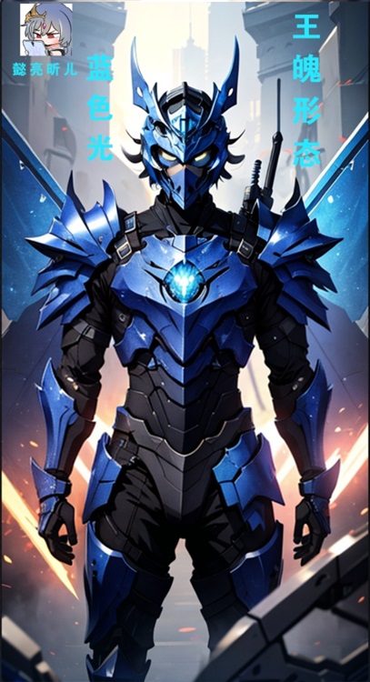 中间则是全身以蓝色为主色,天蓝色和浅蓝色为身上的线条,在其能源指示器内,蕴含着巨大的蓝色宝石,提供无穷无尽的能源,战甲出现一些切点,可以让敌人攻击不到肉体,背后的蓝色披风,是高速空间瞬移防止晕眩用的。