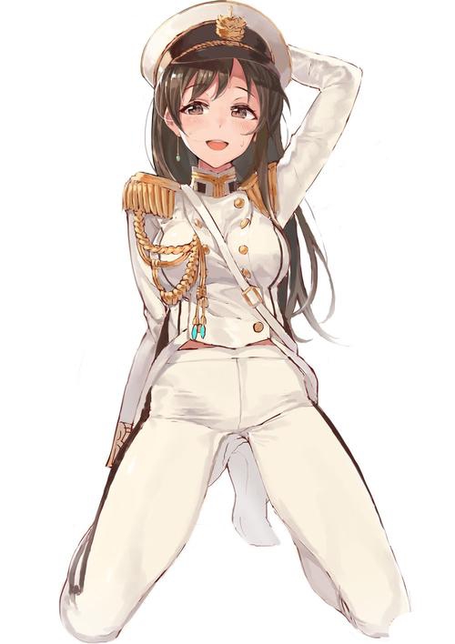 她身着白色礼服上衣,上衣有两排纽扣,着白色无腰带长裤,戴着白色大檐帽,套着一双白色袜子,肩上有硬肩章,手戴白色手套,穿了一双黑色礼服皮鞋。