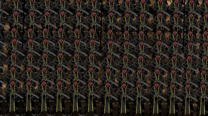 歼灭走向另外一个房间里,房间内是一大群神秘的士兵,微暗的房间被微弱的红光点亮这一群人影。