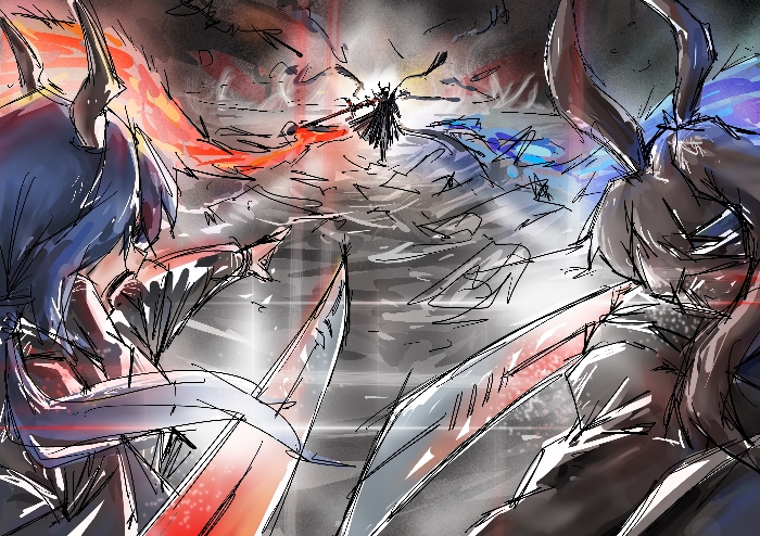 两条龙雷驰而出。红蓝两道剑影切割撕裂塔露拉这一击的火焰。两道雷影交错向前。二人一前一后都来到塔露拉身边。红蓝双龙张开巨口,即将终结这一切。