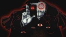 一只黑影形成的巨大地狱犬突然从黑洞中伸出。嘶吼着张开血盆大口咬向二人。莫斯提马和米妮恩斯立刻向后跳去规避攻击。