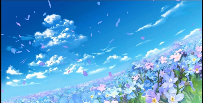 由蓝,紫,粉色花朵所形成的花海,与蔚蓝的天空交接在一起。微风吹起无数花瓣像蝴蝶一样在天空飞舞。