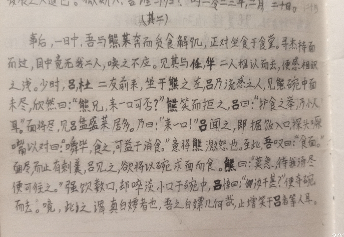 事后,一日中,吾与熊某奔而觅食¹解饥,正对坐食于小食堂。寻杰持面而过,目中竟无钱二人,唤之不应;见其与任、华二人相认输去,便感相识之浅。