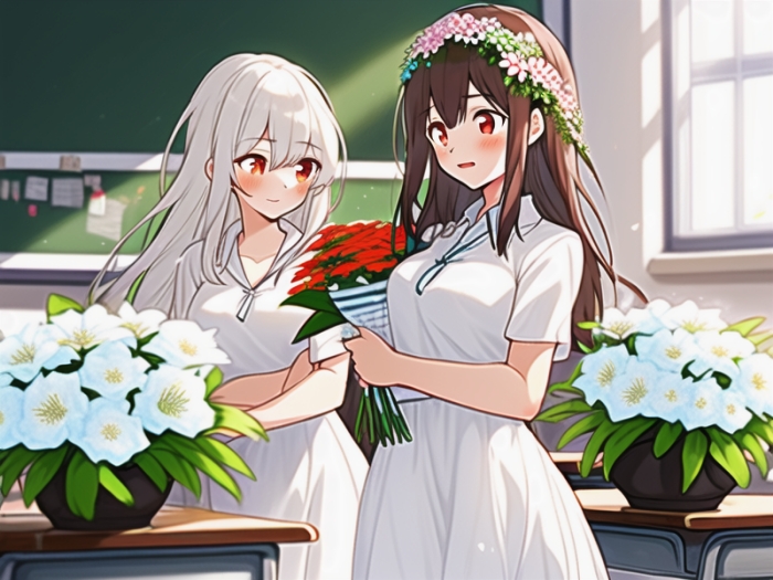 花艺教室里弥漫着清新怡人的花香。美咲和瑞奈坐在一起,开始用百合花编织花环。美咲娴熟的手法让花环越织越漂亮,而瑞奈则有些手忙脚乱。