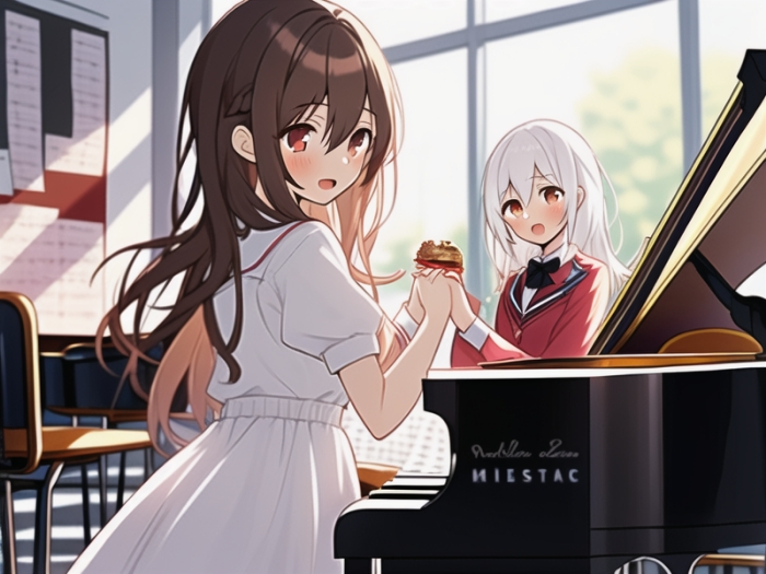 美咲低着头,不敢直视雪菜的眼神。钢琴的音符就像美咲此刻的心情,起伏不定。