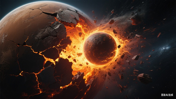 整个星球逐渐解体,压碎,内部的熔岩暴露了出来,发出橙黄的光芒。