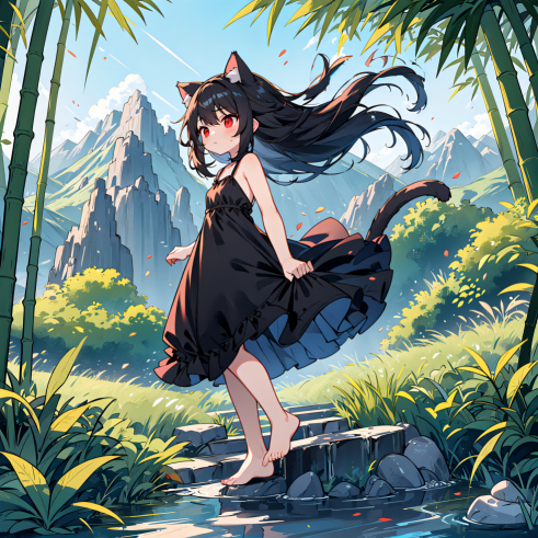 在夕阳下,那一头乌黑靓丽的长发,精致幼小的软萌的脸蛋,还有一双红色的如宝石一般的眼睛,身上穿着一身黑色吊带连衣裙,娇小一握的玉足上穿着可爱的蓝色带小花的人字拖。
