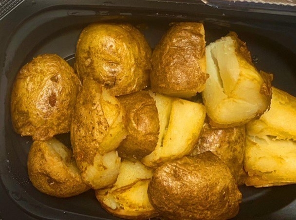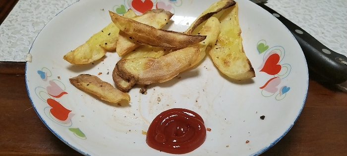 拿出切菜板,把剩下的土豆切成月牙状,在放进烤箱中,在试着烤几分钟至少要让土豆熟起来,等烤好后再拿出来尝了一下,再来点番茄酱