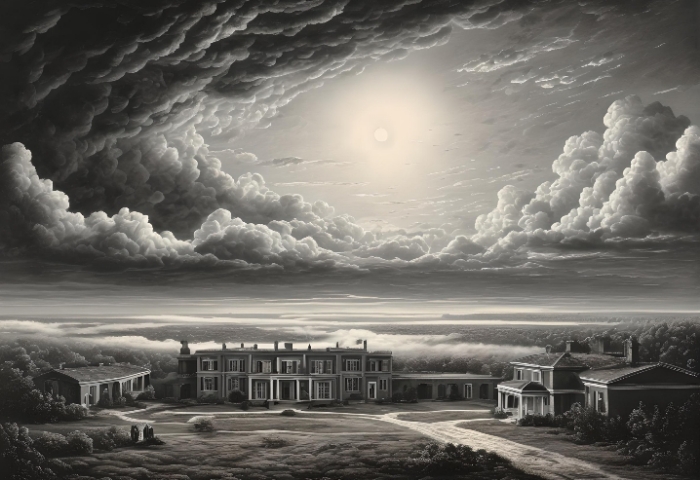 有明佬开路路上没有一个恶魔,有点低阶恶魔甚至都不敢露头。周围的场景也从人间炼狱的场景慢慢变成了城市样貌,上面也有了“太阳”但没有天空,又从地狱风城市样貌遍地豪宅的场景,甚至有了“天空”。明佬带着他们进入了一个黑色豪宅里。