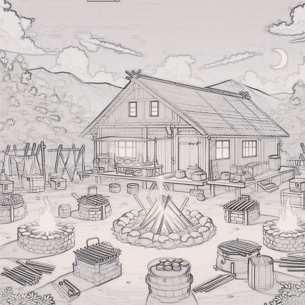 米莉亚母亲——安娜今天所购置的食材被全部放在了院子里,而且在院子的空地上,还生起了柴火,柴火上方架着好几根细铁棒。