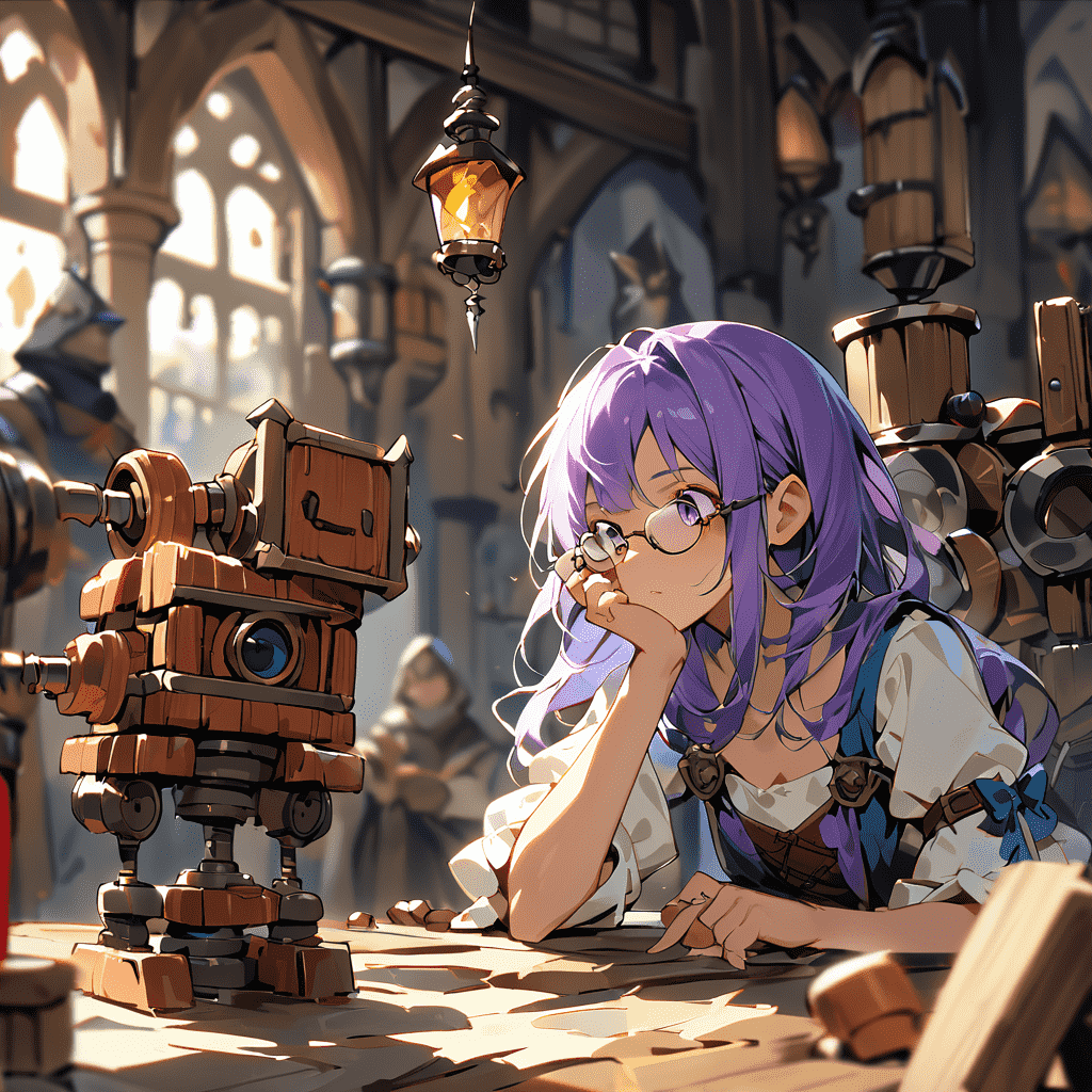紫发少女希维尔,眼镜斜挂在鼻梁上,全神贯注地摆弄着桌上的木制机械,对周围的一切似乎都充耳不闻。