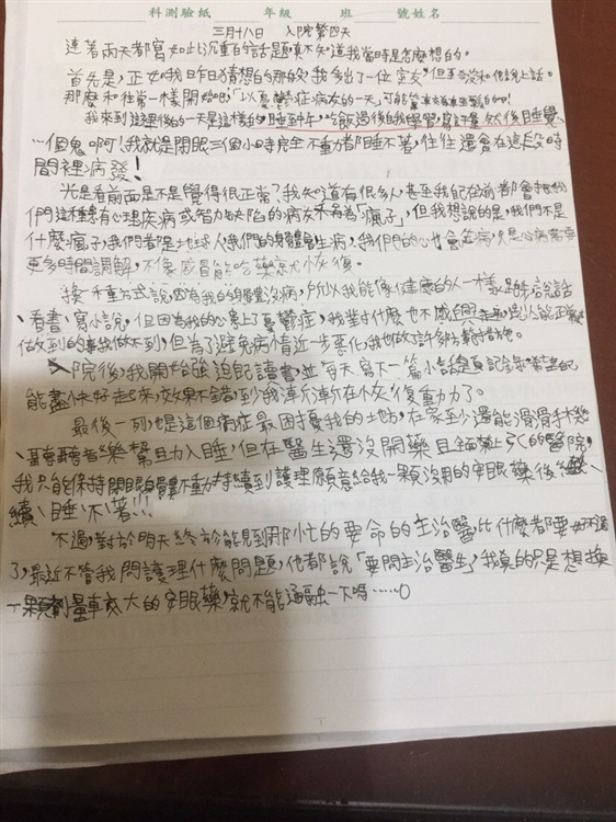 入院后,我开始强迫自己读书,每天写下一篇日记纪录,希望自己能尽快好起来,效果不错,至少我渐渐在恢复动力了。