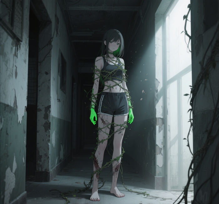 林姐的绿色眼眸在幽暗的楼道里泛着冷光,目光缓缓扫过四周——缠在她脖子上、躯干上的藤蔓不知何时已经松开,像完成了使命般,软软地垂落在地面上,只有那根插入喉咙的粗壮藤蔓还留在原地,随着她的呼吸轻轻颤动。