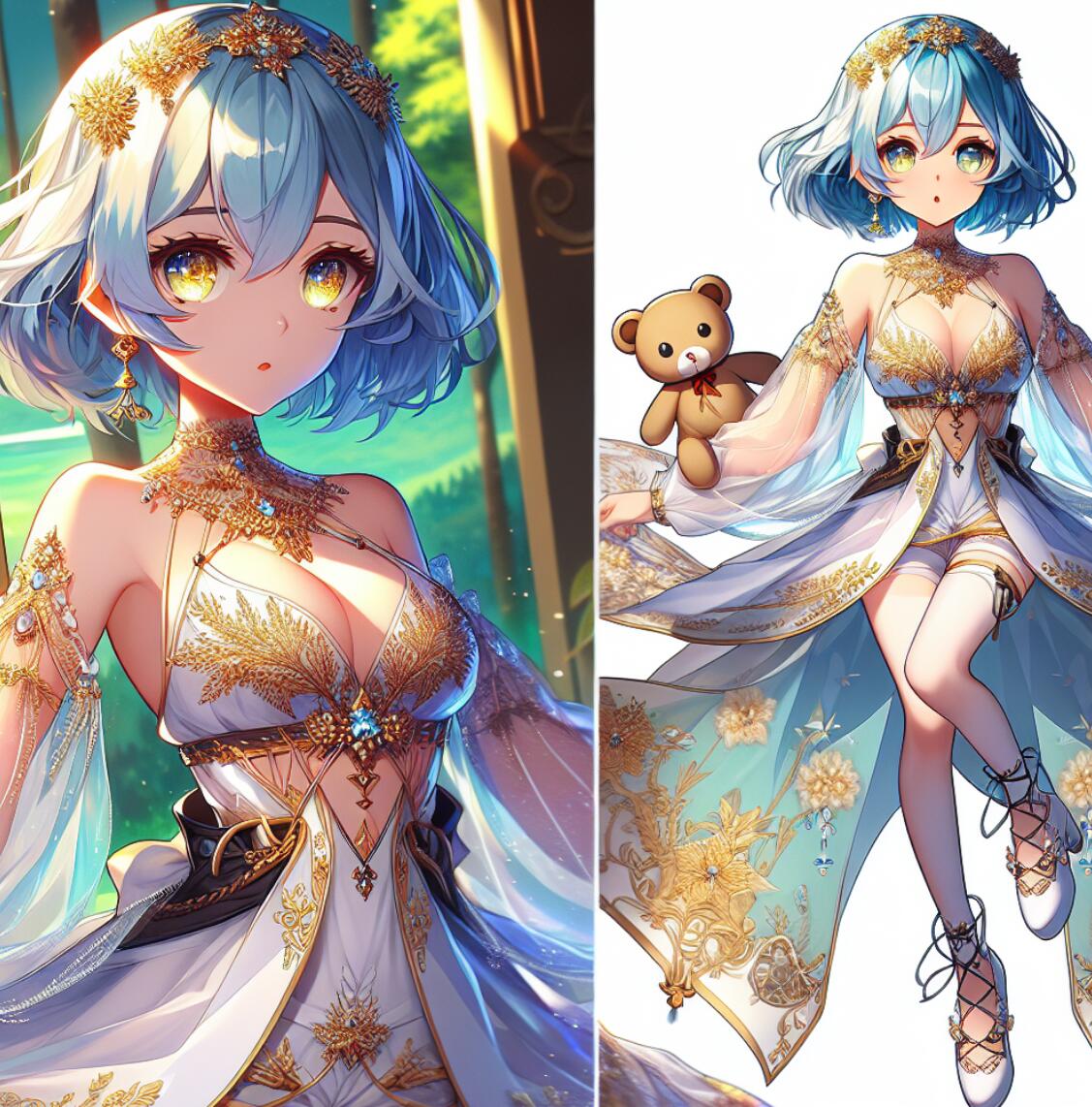 希艾尔穿着一件白色底上有金色刺绣的长袍,留着天蓝色的短发,眼睛是金色的。