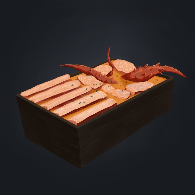 用金色汤汁炖煮的蜘蛛腿,加入大量腿肉的美味佳肴。