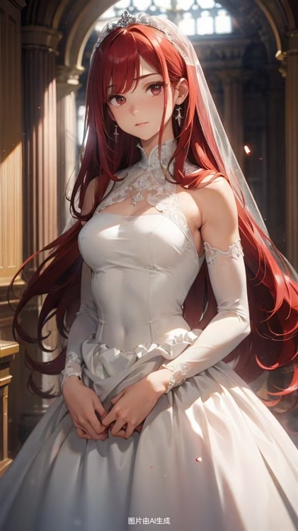 此人身着洁白无瑕的蕾丝婚纱,头戴半透明白色头巾遮住面庞,超长的裙摆一直拖到了大厅的小台阶上,大长腿若隐若现,一头血红的长发盖住她光滑的背部,是的,特征太明显了,西露菲自然一眼就看出来是她的姐姐——西尔维。