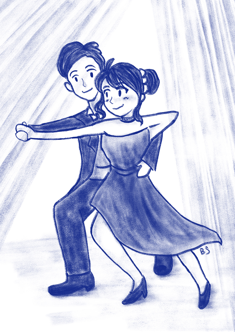 我们准备好跳舞的预备动作后,随即响起了小约翰·施特劳斯的蓝色多瑙河圆舞曲。在起跳的那几步我内心有点胆怯,毕竟我和男校的社团社长阿浚第一次同台合作。
