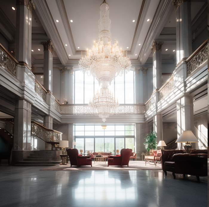 他抬头望向屋顶,白色的灯带犹如一条条沉睡的银蛇,静静地盘踞在那里。灯带发出的光并不刺眼,而是柔和地洒下,在大楼的每一个角落形成淡淡的漫反射。光线与白色大理石相互交织,使得整个环境像是被一层薄纱所笼罩,虚幻而又迷离,给人一种极不真实的感觉,就像是踏入了一个只存在于幻想中的异次元空间。