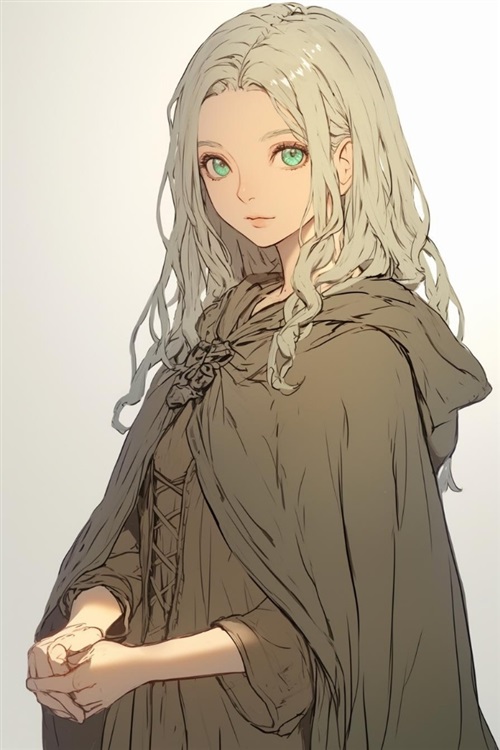 有着灰色的长发和绿色的眼睛。