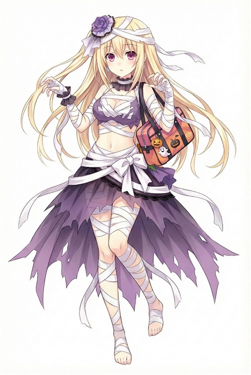绷带之外,她穿着一件紫色的短上衣,下身则是一条破烂风格的紫色长裙。裙摆参差不齐,露出大片被绷带缠绕的白皙肌肤。