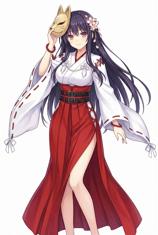 此时的涟姬,身上穿着一套经过改良的红白巫女服,脸上则斜戴着一个绘有红色花纹的狐狸面具,颇有传说中狐仙的韵味。