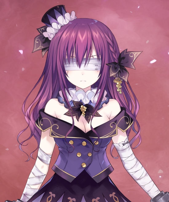 她拥有着一头梦幻般的葡萄紫色中长发,双眼被厚厚的绷带所缠住,看不见她脸上的表情。更令人在意的是,她那白皙的手腕与脚踝处,都扣着沉重的镣铐。