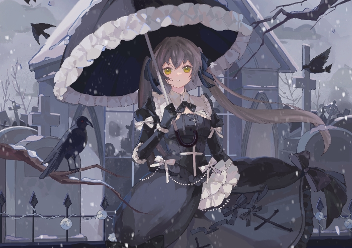 什迩香小姐换了一身黑色的衣服,外面则套了一件较厚的外套保暖,她的手里还拿着一把黑色的雨伞——她里面那身衣服和伞很新,并没有用过多少次。