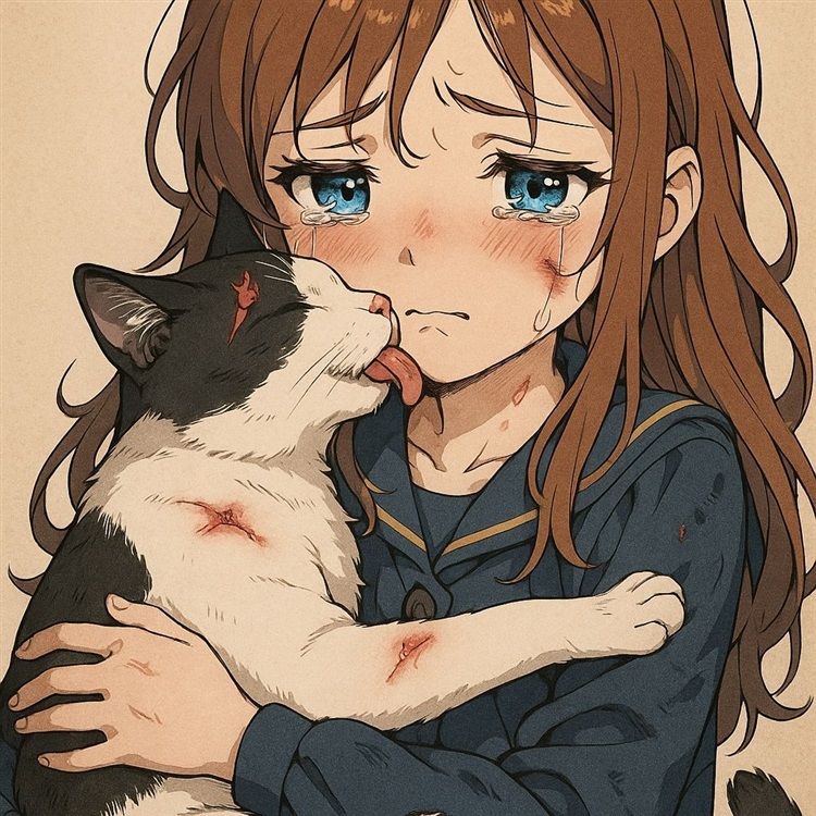 刘楚熙跑了,小猫轻轻走过,蹭蹭佳佳的小腿,被抱起,小猫亲昵用舌头舔着佳佳脸上的伤口。