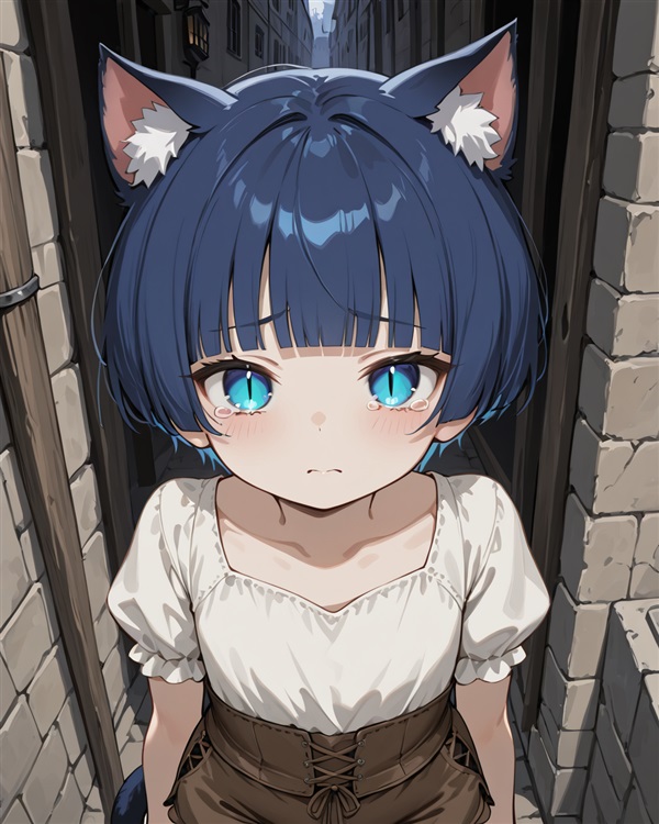 猫女孩有着一头深蓝色的短发,身上却穿着一身单薄的衣服,表情也是一副要哭的表情。