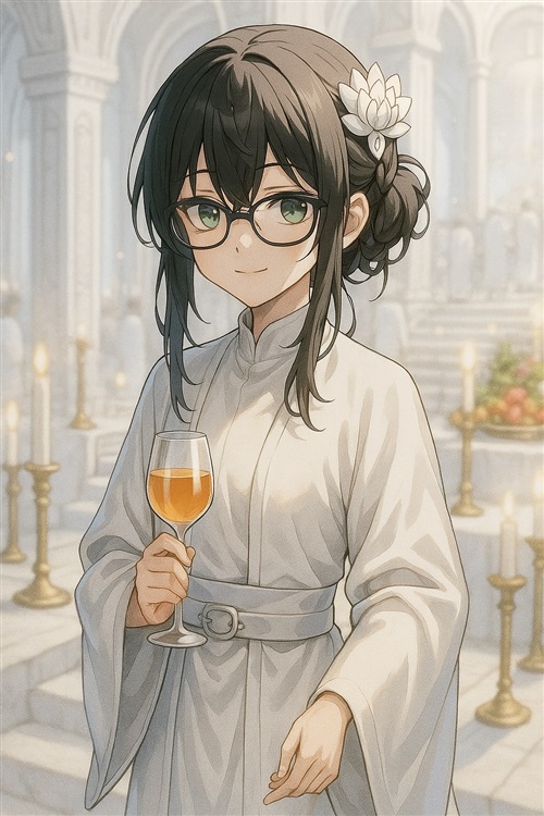 米莎卡换下了一身脏兮兮的工装,穿上了一件纯白色的、质地精良的长袍,长袍上绣着复杂的银色图纹,头顶洁白的发饰,似乎象征着她技术与信仰结合的身份。乱糟糟的黑发似乎在短时间内精心梳理过,那副像是本体的黑框眼镜依旧架在鼻梁上,但她眼神中那份懒散不知何时已经一扫而空,取而代之的,是一种深沉的平静。