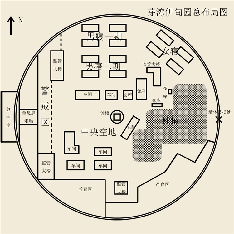 成员们在伊甸园内部的可活动空间类似被啃食过的大饼。北方是八栋男子宿舍,分为两期,楼栋之间有大片空地。往中心去有数座厂房,仓库。女子宿舍在东北方向,和男子一样,女子宿舍同样是四层楼,只不过只有四栋,包括地下室在内约可容纳五千人以上。东南面靠中心的方向是布拉格他们平时工作的种植园,有一小部分地已经荒废了好些日子。再往外靠就是产育区大院这里人工生产着猪牛羊等幼崽,只是大门常年紧闭,没人知道里头什么样,偶尔可见马车从院子里驶出。西南侧的屋子为教育区,有着类似梓茵学校的功能,布拉格也是从这里面出来的。这个地方只出不进,曾经布拉格想要重新进去看看,可刚在门口呆了一下他就被“劝离”了。在伊甸园建筑群中心,有着巨大的钟楼,普通成员无法进入,平时成员们做集会的地方也正是在这附近的空地。