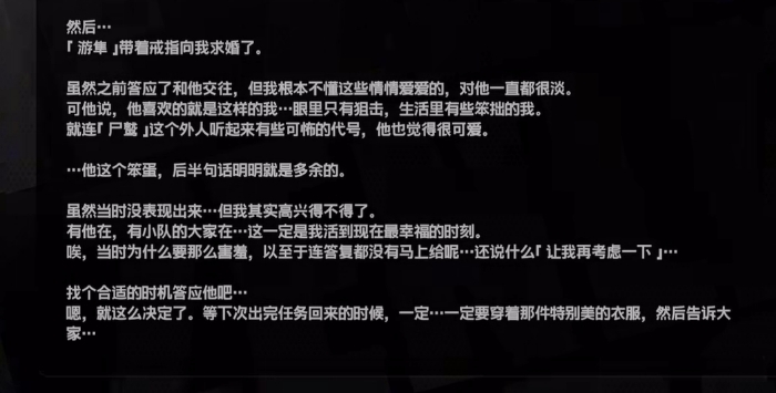 *释③:佐伊得知自己的小队被军队抛弃后,开始狙杀那些表决放弃支援她小队的人,通过幸存者的身份接近那些人,常表现为用狙击戏耍受害者,和猫戏老鼠一样。